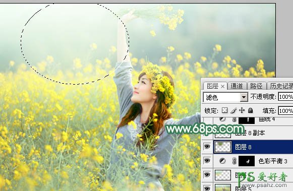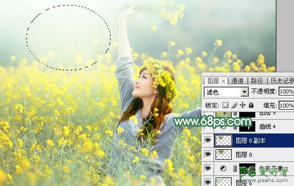 17、新建一个图层,用椭圆选框工具拉出下图所示的椭圆选区,羽化45个像素后填充暗绿色:#708633,取消选区后把混合模式改为“滤色”,效果如下图。