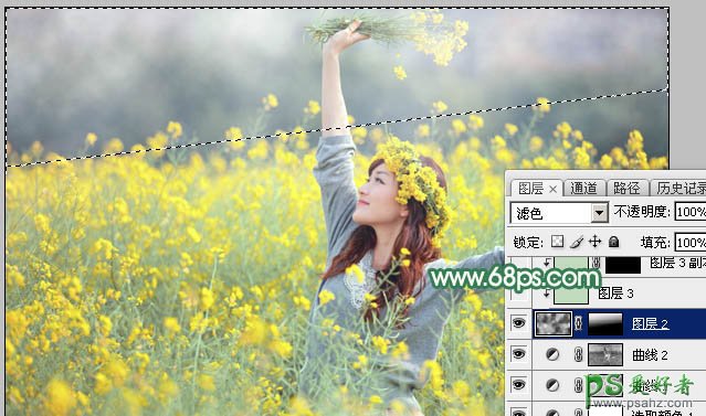 4、新建一个图层,按字母键“D”,把前,背景颜色恢复到默认的黑白,然后选择菜单:滤镜 > 渲染 > 云彩,确定后把混合模式改为“滤色”。 按住Alt键添加图层蒙版,然后用透明度较低柔边白色画笔把顶部区域擦出来,如下图。这一步增加图片顶部区域亮度。