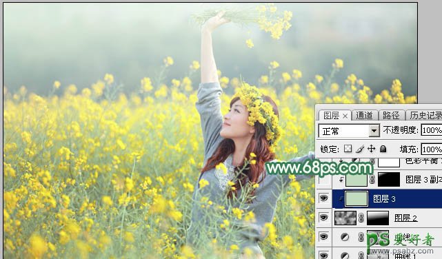 5、创建纯色调整图层,颜色设置为淡绿色:#C2DBBE,确定后按Ctrl + Alt + G 创建剪切蒙版,效果如下图。这一步给顶部增加淡绿色高光。