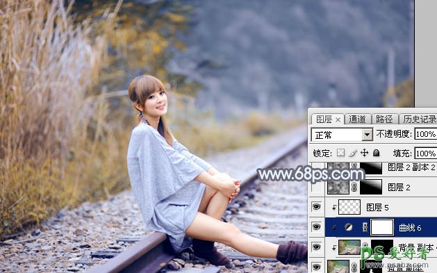 PS调色教程:学习给外景铁路上自拍的美女艺术照调出秋季淡冷色