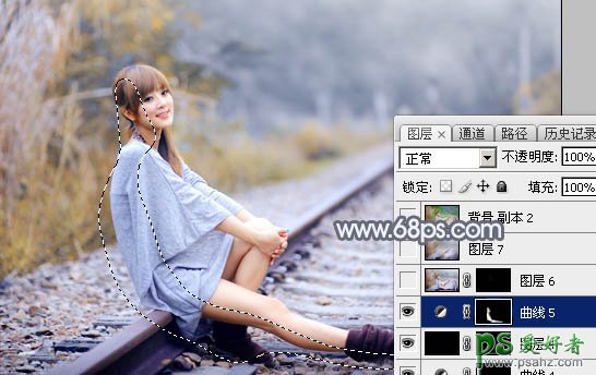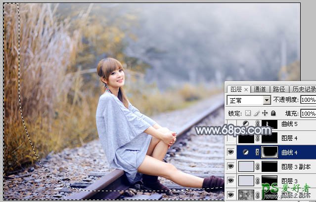 18、创建曲线调整图层,把RGB通道压暗一点,参数设置如图46,确定后把蒙版填充黑色,然后用柔边白色画笔把左侧及底部区域擦出来,效果如图47。这一步给图片增加暗角。