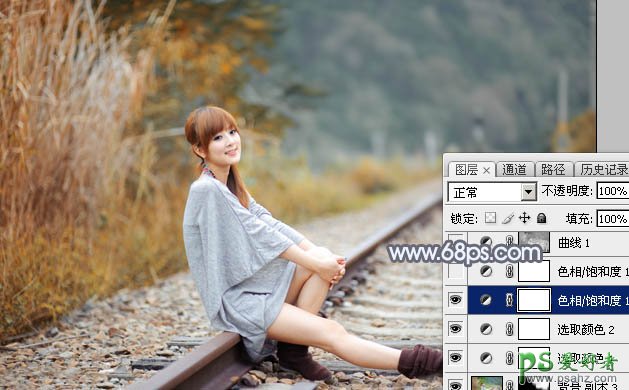 PS调色教程:学习给外景铁路上自拍的美女艺术照调出秋季淡冷色