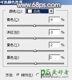 10、创建可选颜色调整图层,对红、黄、白进行调整,参数设置如图31 - 33,确定后创建剪切蒙版,效果如图34。这一步微调暗部暖色。