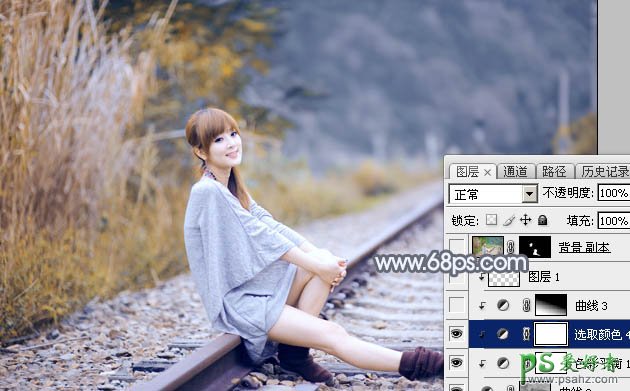 PS调色教程:学习给外景铁路上自拍的美女艺术照调出秋季淡冷色