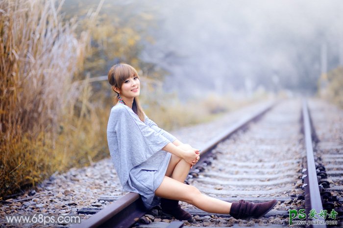 PS调色教程:学习给外景铁路上自拍的美女艺术照调出秋季淡冷色效果,转秋季效果的时候,把美女素材图主色转为暖色;中间调及暗部颜色转为中性色;最后再给高光的地方加上淡蓝色,局部做一下渲染即可实现。