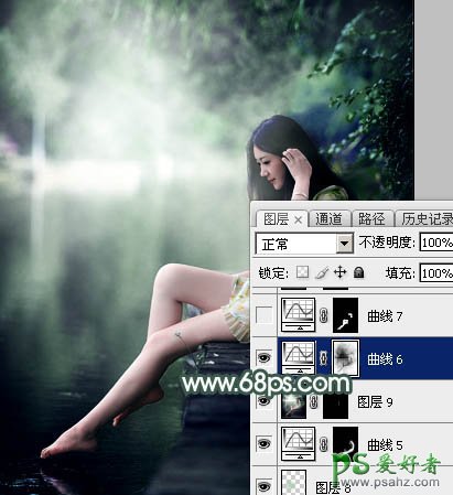 22、按Ctrl + Alt + 2 调出高光选区,按Ctrl + Shift + I 反选得到暗部选区,然后创建曲线调整图层,对RGB、红、绿、蓝通道进行调整,参数及效果如下图。这一步把暗部稍微调暗,并增加冷色。