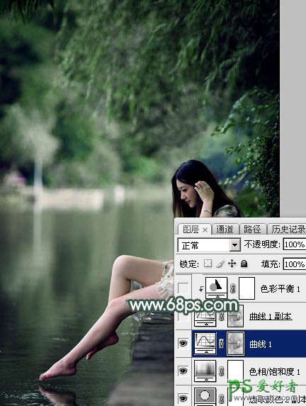 4、按Ctrl + Alt + 2 调出高光选区,按Ctrl + Shift + I 反选得到暗部选区,然后创建曲线调整图层,对RGB、红、绿、蓝通道进行调整,参数设置如图7 - 10,效果如图11。这一步把图片暗部调暗,并增加蓝绿色。