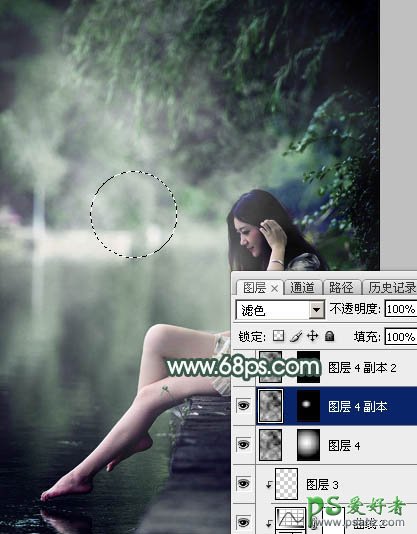 9、按Ctrl + J 把当前图层复制一层,把蒙版填充黑色,然后用透明度较低柔边白色画笔把下图选区部分擦出来,增加烟雾中间的亮度。