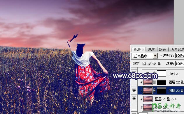 12、按Ctrl + J 把天空素材复制一层,创建剪切蒙版后把混合模式改为“正片叠底”。按住Alt键添加图层蒙版,然后用透明度较低白色画笔把顶部区域涂暗一点,效果如下图。