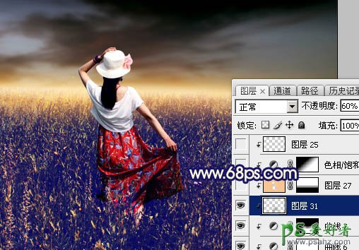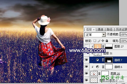 24、新建一个图层,创建剪切蒙版,把前景色设置为暗蓝色:#0A0E2B,确定后用透明度较低柔边画笔把人物底部区域涂暗,效果如下图。