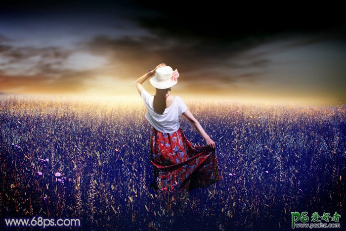 :给唯美女生外拍写真照片调出暖暖的蓝褐色,教程用到了霞光素材,色彩调整等操作,让