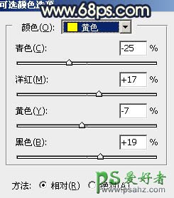 1、打开原图素材大图,创建可选颜色调整图层,对黄色,绿色进行调整,参数设置如图1,2,确定后用柔边黑色画笔把左上角区域擦出来,效果如图3。这一步给背景部分增加暖色。