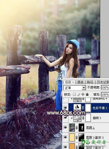 Photoshop给景区木桩边自拍的唯美少女艺术照调出高对比蓝黄色
