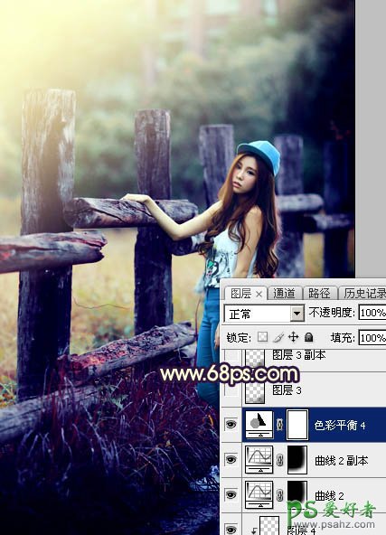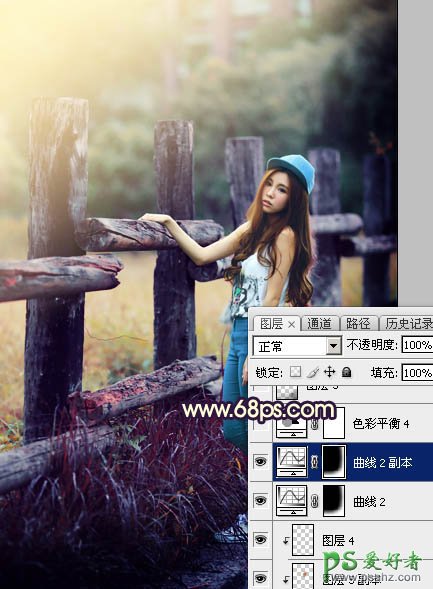 Photoshop给景区木桩边自拍的唯美少女艺术照调出高对比蓝黄色