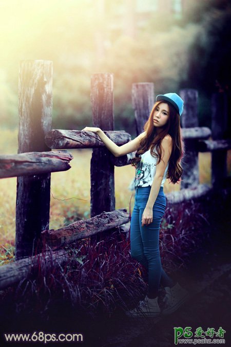 Photoshop给景区木桩边自拍的唯美少女艺术照调出高对比蓝黄色,调色的时候,需要把暗部区域单独压暗,并增加蓝色;然后把稍亮的黄绿色转为橙黄色;最后再给局部增加明暗度即可实现,喜欢的朋友们好好学习一下吧!