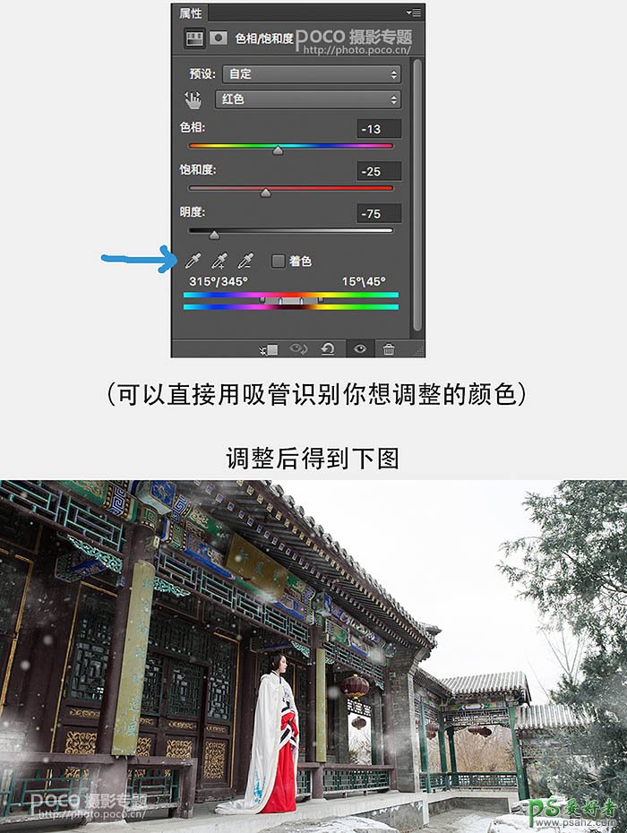 2、调整背景的大面积红色 同样利用“色相/饱和度”工具,选择图层蒙版,单独对背景的红色进行调整。(可以用吸管工具识别你想要调整的颜色)。