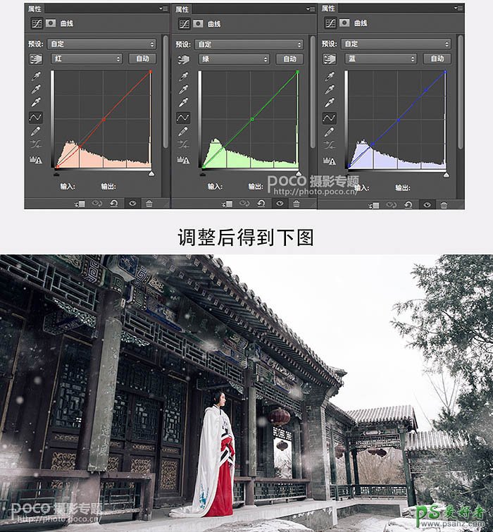 5、利用曲线调整整体颜色 经过上面的“色相/饱和度”处理,整体效果差不多出来了,但感觉色彩层次还是不够。因此,利用曲线RGB调整画面整体明暗部的颜色。其中,红色曲线暗部加青、绿色曲线暗部添加少许洋红、蓝色曲线暗部添加少许蓝色,目的就是为了让暗部更加“青蓝”,如此一来,处于中间调的人物自然就突出了。