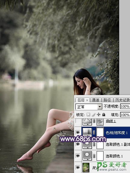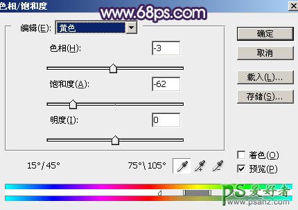 3、创建色相/饱和度调整图层,对黄色,绿色进行调整,参数及效果如下图。这一步快速把图片中的黄绿色转为中性色。