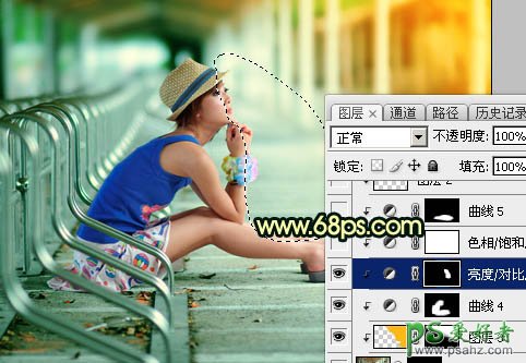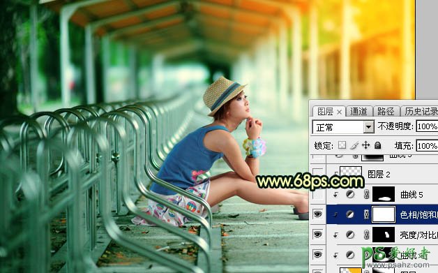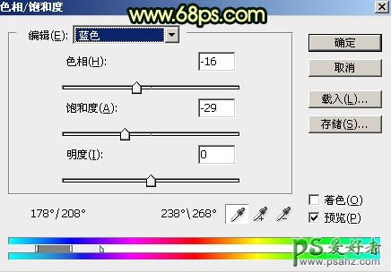 16、创建色相/饱和度调整图层,对蓝色进行调整,参数设置如图35,确定后创建剪切蒙版,效果如图36。这一步微调一下人物衣服颜色。