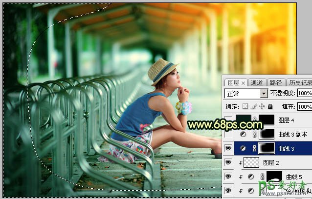18、创建曲线调整图层,对RGB、红、绿通道进行调整,参数设置如图38,确定后把蒙版填充黑色,然后用柔边白色画笔把左侧及底部区域涂暗一点,效果如图39。这一步给图片增加暗角。