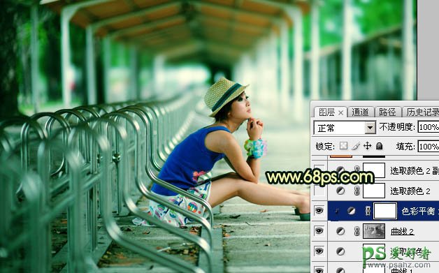 5、创建色彩平衡调整图层,对阴影、中间调、高光进行调整,参数设置如图13 - 15,确定后按Ctrl + Alt + G 创建剪切蒙版,效果如图16。这一步给图片暗部增加青蓝色。