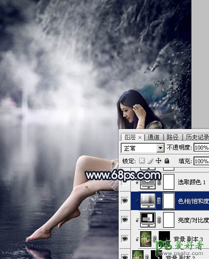 PS美女图片调色:给春天里湖边自拍的清纯少女玉腿美脚写真照调出梦幻的暗蓝色,效果图为冷色图片,调色的时候可以先降低主色饱和度,得到中性图片;最后再增加淡蓝色,调整一下高光及主色,整体再柔化处理一下即可,喜欢的朋友们好好学习一下吧! 原图 最