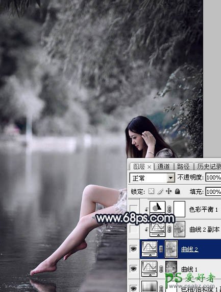 4、按Ctrl + Alt + 2 调出高光选区,按Ctrl + Shift + I 反选得到暗部选区,然后创建曲线调整图层,对RGB,蓝通道进行调整,参数设置如图8,9,效果如图10。这一步主要加大暗部明暗对比,并增加蓝色。