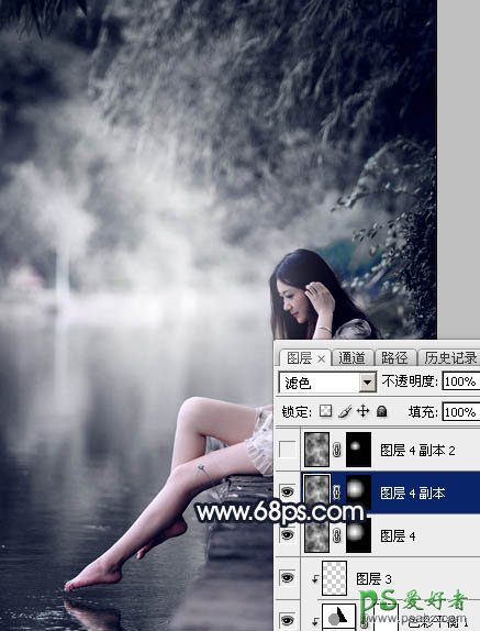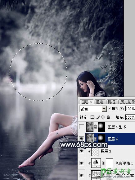 7、新建一个图层,按字母键“D”把前,背景颜色恢复到默认的黑白,然后选择菜单:滤镜 > 渲染 > 云彩,确定后把混合模式改为“滤色”,按住Alt键添加图层蒙版,用透明度较低的柔边白色画笔把下图选区部分涂亮一点。