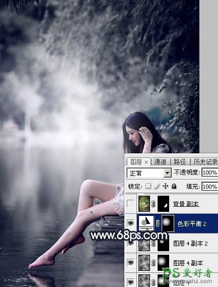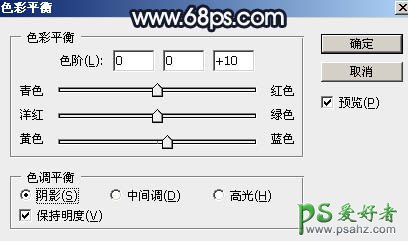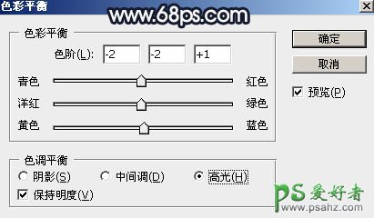 10、创建色彩平衡调整图层,对阴影,高光进行调整,参数设置如图18,19,确定后把蒙版填充黑色,然后用透明度较低的柔边白色画笔把图20所示的区域涂出来。这一步给图片局部高光区域增加蓝色。