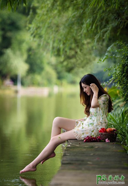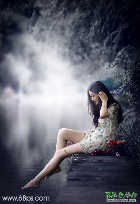 PS美女图片调色:给春天里湖边自拍的清纯少女玉腿美脚写真照调出梦幻的暗蓝色,效果图为冷色图片,调色的时候可以先降低主色饱和度,得到中性图片;最后再增加淡蓝色,调整一下高光及主色,整体再柔化处理一下即可,喜欢的朋友们好好学习一下吧!