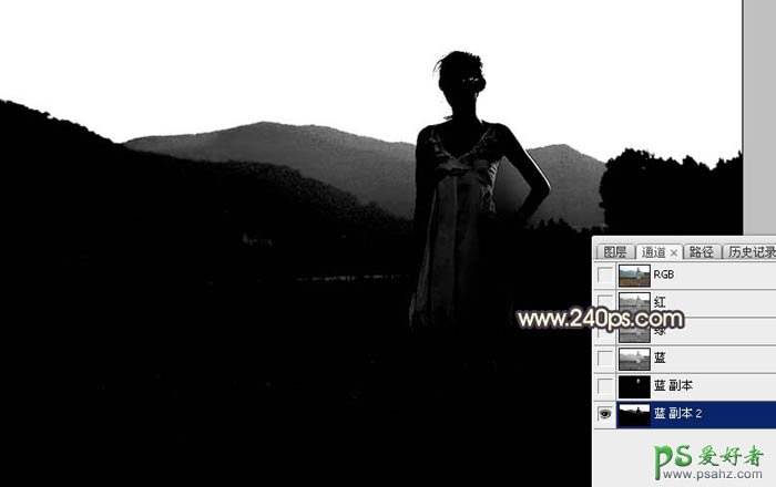 6、进入通道面板,把蓝色通道复制一份,然后对蓝副本通道进行操作。按Ctrl + M 调整曲线,增加明暗对比,天空部分调成白色,其它区域压暗。确定后再用柔边黑色画笔把天空以外的区域涂暗一点,如下图。