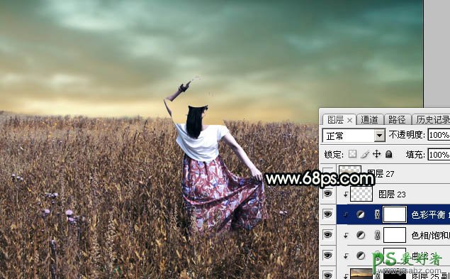 PS女生照片调色:给美丽田野上的漂亮女生写真照调出柔美的青黄色