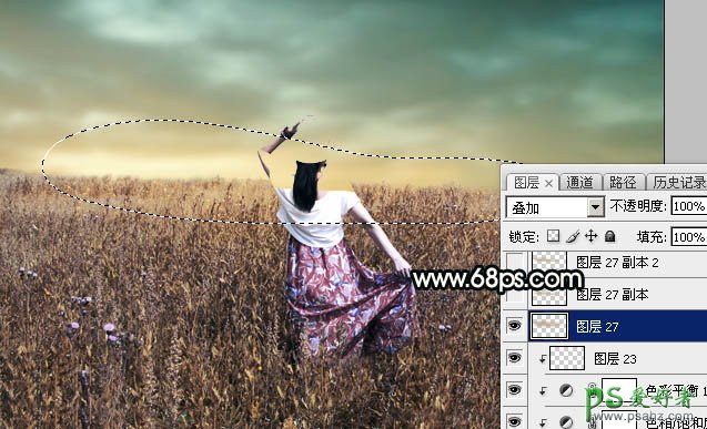 14、新建一个图层,用套索工具勾出下图所示的选区,羽化40个像素后填充黄褐色:#BDA889,取消选区后把混合模式改为“叠加”,效果如下图。