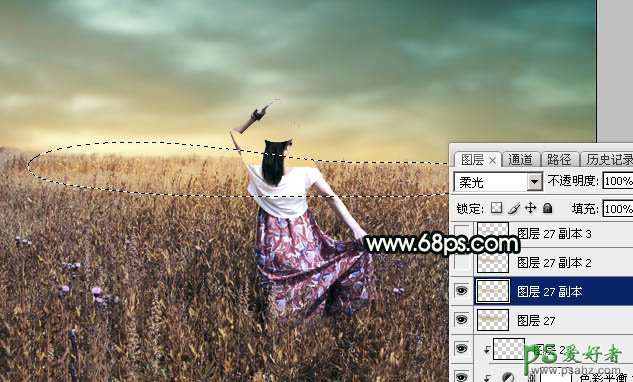 15、新建一个图层,用套索工具勾出下图所示的选区,羽化30个像素后填充黄褐色:#BDA889,取消选区后把混合模式改为“柔光”,效果如下图。