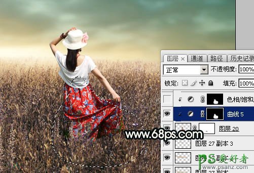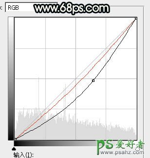 19、创建曲线调整图层,对RGB,红通道进行调整,参数设置如图41,确定后创建剪切蒙版,然后把蒙版填充黑色,再用柔边白色画笔把人物裙子背光区域涂暗,效果如图42。