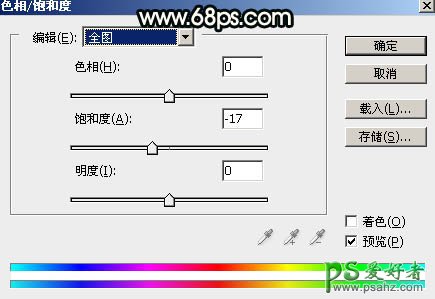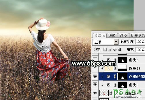 20、创建色相/饱和度调整图层,对全图进行调整,参数设置如图43,确定后创建剪切蒙版,再把蒙版填充黑色,然后用柔边白色画笔把人物裙子部分涂出来。这一步降低裙子颜色鲜艳度。