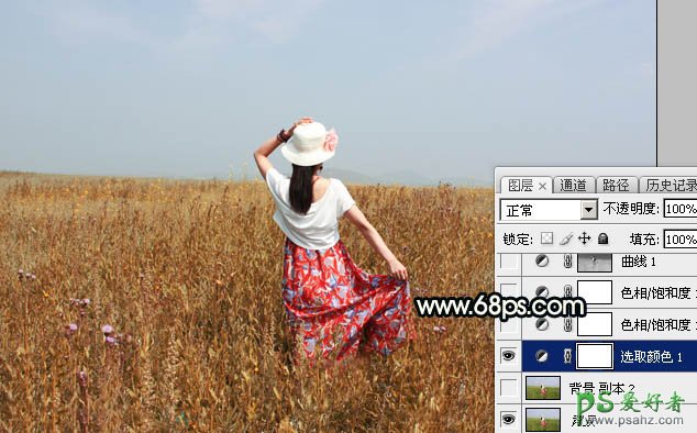 PS女生照片调色:给美丽田野上的漂亮女生写真照调出柔美的青黄色