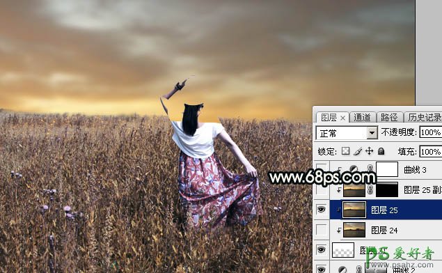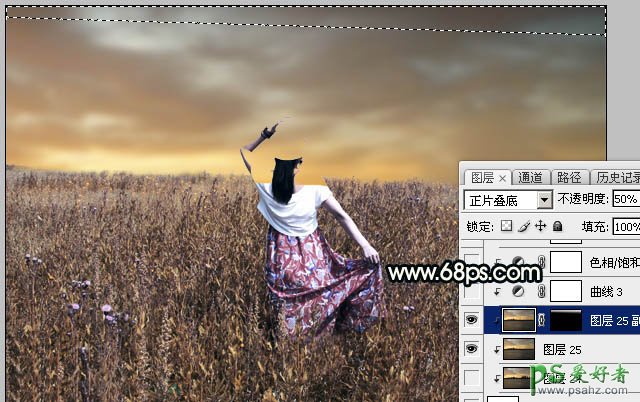 10、按Ctrl + J 把当前图层复制一层,创建剪切蒙版后把混合模式改为“正片叠底”,不透明度改为:50%。按住Alt键添加图层蒙版,用透明度较低的柔边白色画笔把顶部区域涂暗一点,效果如下图。