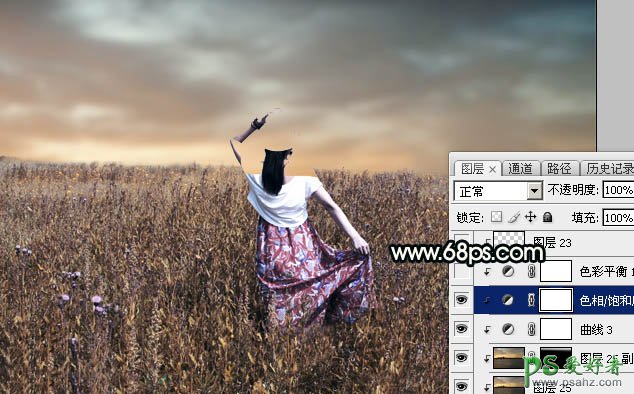 PS女生照片调色:给美丽田野上的漂亮女生写真照调出柔美的青黄色