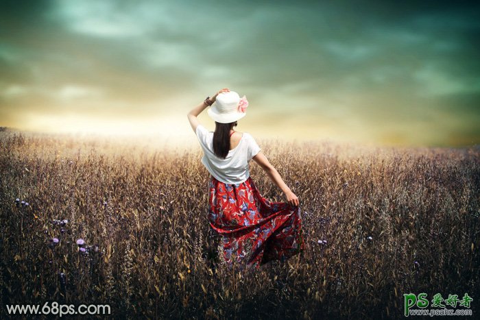 PS女生照片调色:给美丽田野上的漂亮女生写真照调出柔美的青黄色