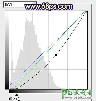 <图12> 4、按Ctrl + Alt + 2 调出高光选区,按Ctrl + Shift + I 反选得到暗部选区,然后创建曲线调整图层,对RGB、绿、蓝通道进行调整,参数及效果如下图。这一步把图片暗部颜色调暗,并增加蓝紫色。