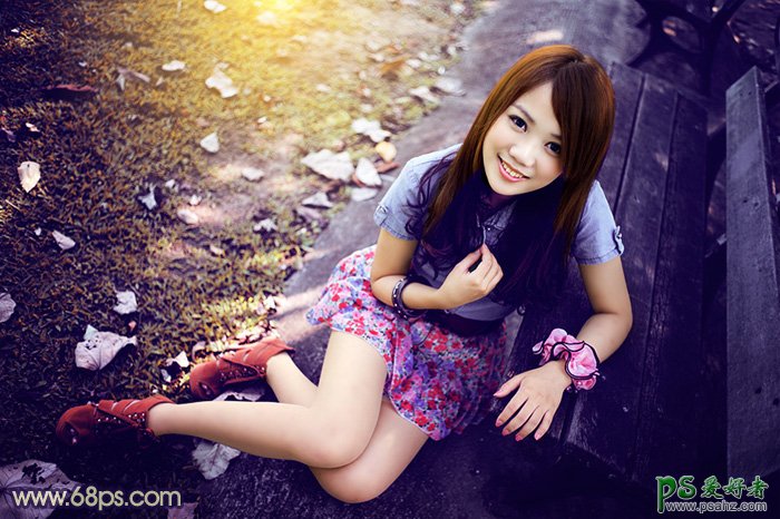 PS美女图片调色教程:给清新草地上的可爱女孩生活照调出偏冷的淡紫色效果,调色的时候只需要把草地颜色转为黄褐色;暗部颜色转为蓝紫色;最后再给局部加上高光效果即可,喜欢的朋友们动手试一下吧!原图