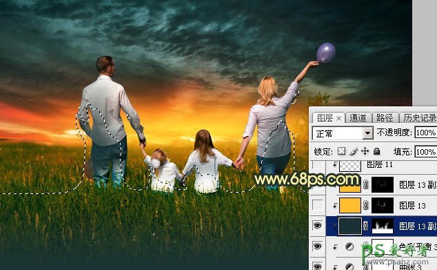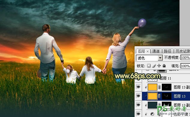 23、新建一个图层,创建剪切蒙版,混合模式改为“滤色”,把前景色设置为橙黄色:#FFBE2E,然后画笔把人物受光区域边缘涂亮,如下图。
