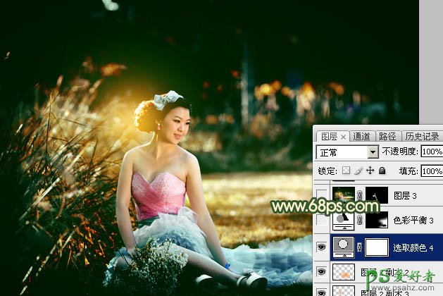 Photoshop给绿草地上的唯美女生婚纱照调出漂亮的高对比度秋景色