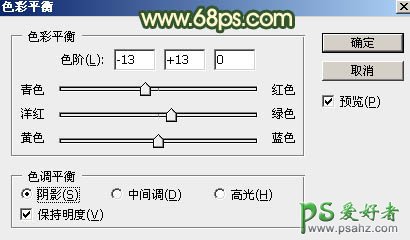20、创建色彩平衡调整图层,对阴影,中间调进行调整,参数设置如图48,49,确定后把蒙版填充黑色,用白色画笔把右侧部分擦出来,效果如图50。这一步给右侧局部增加暗绿色。