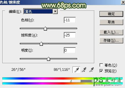 5、创建色相/饱和度调整图层,对黄色进行调整,参数设置如图12,确定后把蒙版填充黑色,用透明度较低的柔边白色画笔把较亮的草地部分擦出来,如图13。这一步把过亮的草地调暗一点。
