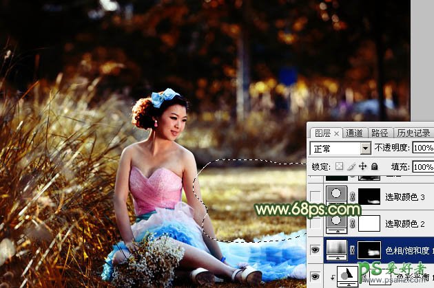Photoshop给绿草地上的唯美女生婚纱照调出漂亮的高对比度秋景色