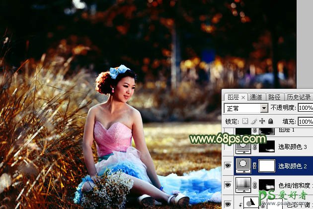 Photoshop给绿草地上的唯美女生婚纱照调出漂亮的高对比度秋景色