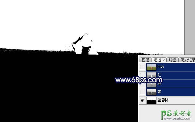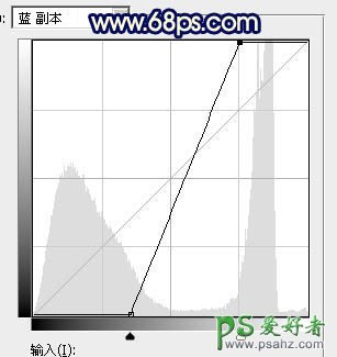 6、现在来处理天空部分。把背景图层复制一层,按Ctrl + Shift + ] 置顶,进入通道面板,把蓝色通道复制一份,得到蓝副本通道,按Ctrl + M 对蓝副本通道调整曲线,把高光调亮,暗部压暗如图19。确定后用黑色画笔把草地部分涂黑,再用白色画笔把天空部分涂成白色,如图20。