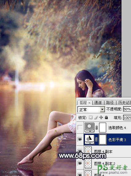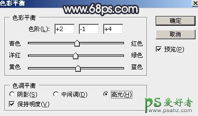 18、创建色彩平衡调整图层,对阴影,高光进行调整,参数设置如图44,45,确定后把图层不透明度改为:50%,效果如图46。这一步给图片增加淡红色。